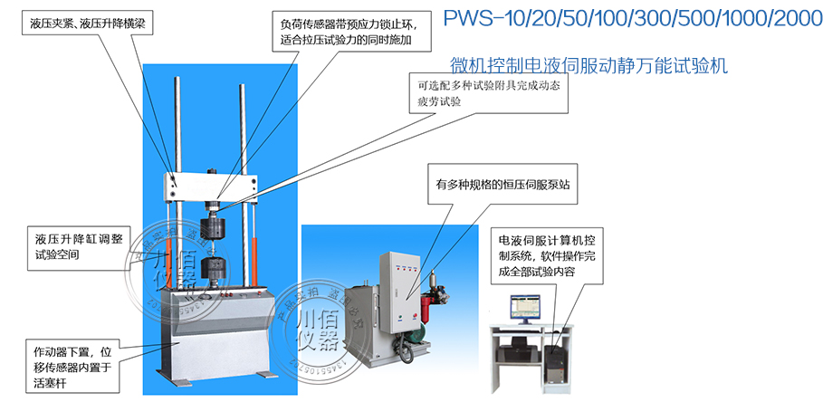該系列電液伺服動靜萬能試驗機由主機、泵站、伺服控制系統、計算機與軟件系統、試驗附具以及管路系統等組成。